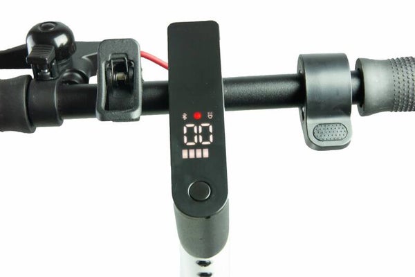 Het brein van de elektrische step bevind zich in dit led paneel, van hier uit worden de meeste functies van de step gemonitord en met een druk op de knop gaat de step aan of uit. Als je nog een keer de knop indrukt gaat de verlichting aan of uit, dit is ook te regelen in de mobiele app. Ook zie je of je verbonden bent met bluetooth, of de verlichting aan is en of de step zich in sport of economische stand bevind.
